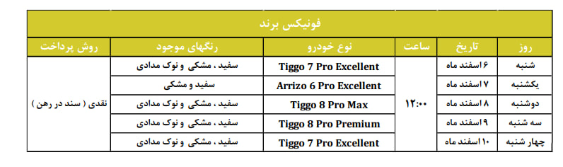 بر اساس اعلام مدیران خودرو از روز شنبه مورخ ۱۴۰۱/۱۲/۰۶ شرایط فروش نقدی از طریق درگاه اینترنتی ebuy.mvm.ir برای برخی از محصولات برند فونیکس مطابق با شرایط مندرج در اطلاعیه فروش، ارائه می گردد.