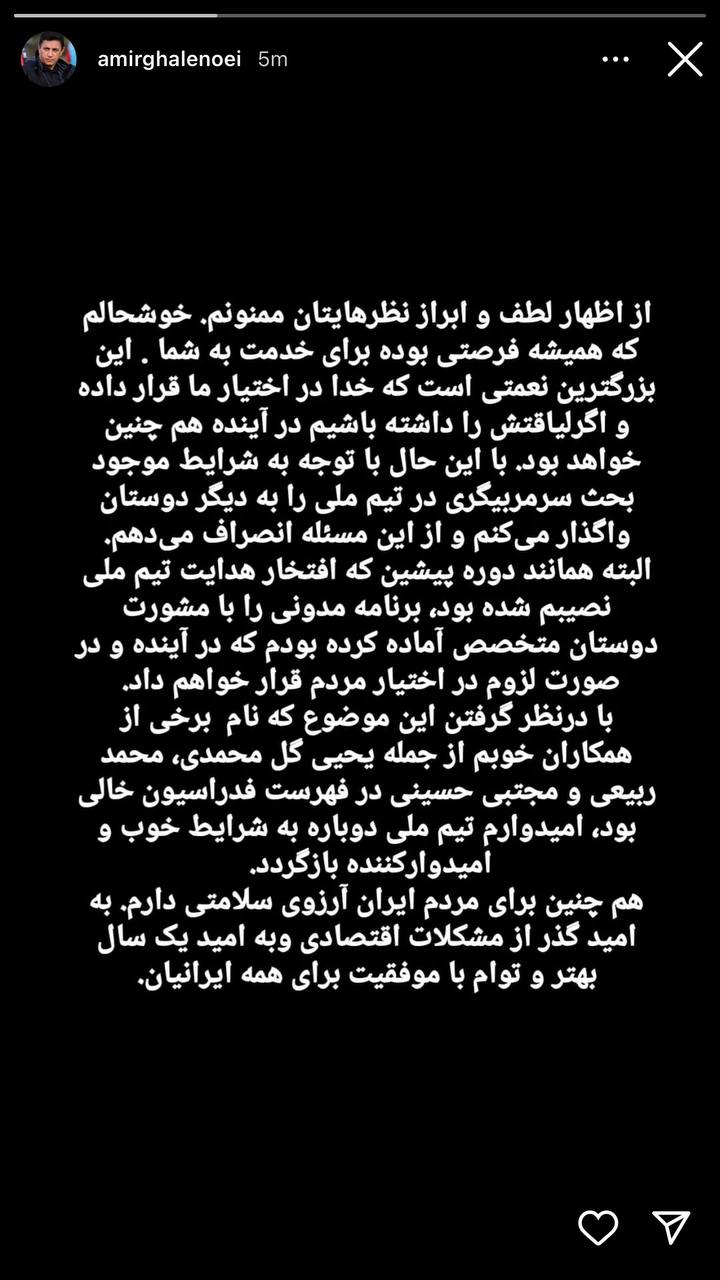 امیر قلعه نویی دقایقی پیش با انتشار یک استوری رسما این موضوع را اعلام کرد. او در این استوری نوشت: