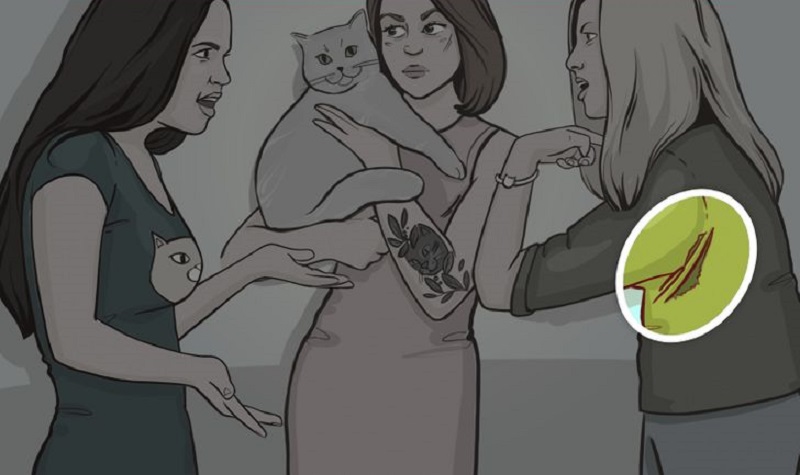 اگر به دختران با دقت نگاه کنید، می توانید صاحب گربه واقعی را شناسایی کنید. گربه متعلق به دختر بلوند سمت راست است زیرا گربه پیراهنش را پاره کرده است.