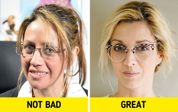اگر عینکی هستید بهتر است از استفاده از عینک های فریم باریک خودداری کنید. سعی کنید از عینک هایی با فریم های پهن تر یا رنگی تری استفاده کنید که بر روی اجزای چهره ایجاد تأکید می کنند. به علاوه، به یاد داشته باشید که فریم های مشکی یا قهوه ای هم می توانند سن را بالاتر نشان دهند، به ویژه اگر آرایش داشته باشید.