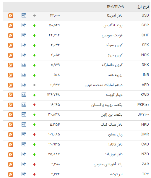بانک مرکزی امروز سه شنبه (۹ اسفند)، نرخ هر دلار را ۴۲ هزار ریال، پوند را ۵۰ هزار و ۵۴۹ و یورو را ۴۴ هزار و ۴۹۹ ریال اعلام کرد.