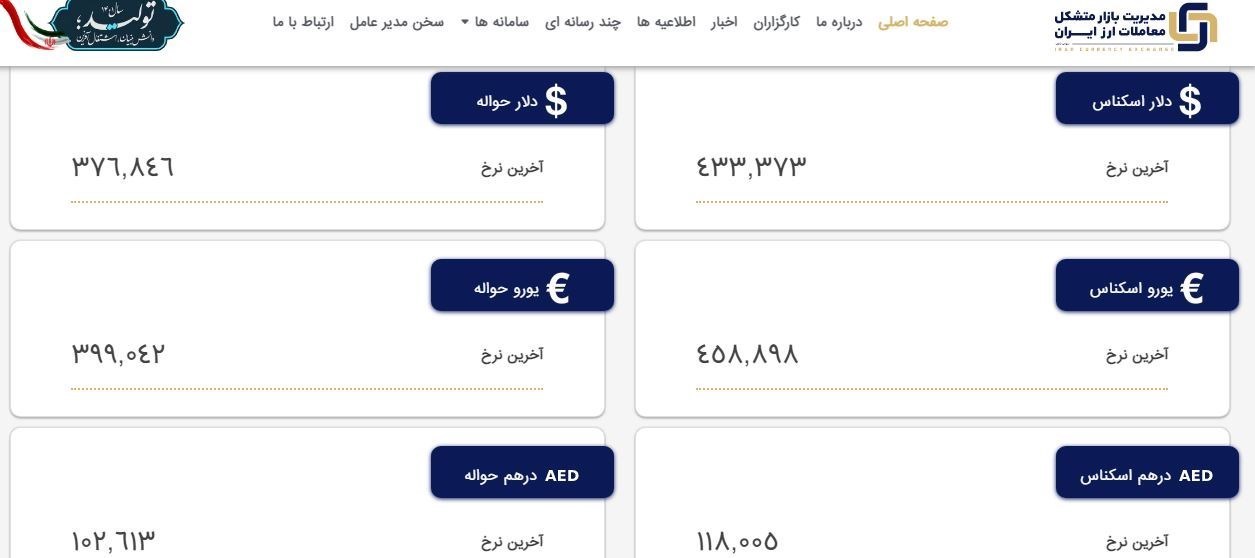 از 8 اسفندماه علاوه بر قیمتهای اسکناس و حواله دلار، قیمت اسکناس و حواله یورو و درهم نیز در سایت بازار متشکل درج میشود؛ بر همین اساس نیز نرخ اسکناس یورو 45 هزار و 889 تومان، و نرخ حواله یورو 39 هزار و 904 تومان اعلام شده است.