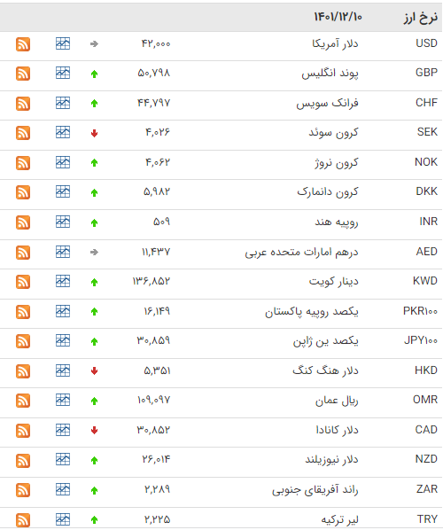 [نرخ رسمی پوند و یورو افزایش یافت] به گزارش خبرگزاری صداوسیما، بانک مرکزی امروز چهارشنبه (۱۰ اسفند)، نرخ هر دلار را ۴۲ هزار ریال، پوند را ۵۰ هزار و ۷۹۸ و یورو را ۴۴ هزار و ۵۳۰ ریال اعلام کرد.