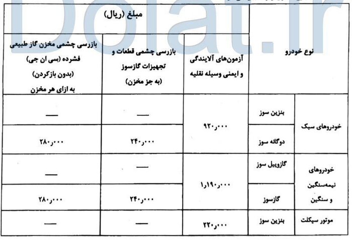 هیأت وزیران به پیشنهاد مشترک وزارتخانه‌های کشور و راه و شهرسازی و به استناد تبصره (۴) ماده (۶) قانون هوای پاک - مصوب ۱۳۹۶ - نرخ بهای خدمات صدور گواهی معاینه فنی ماشینی (مکانیزه خودروها و موتورسیکلت‌ها) را تعیین کرد که به شرح زیر است: