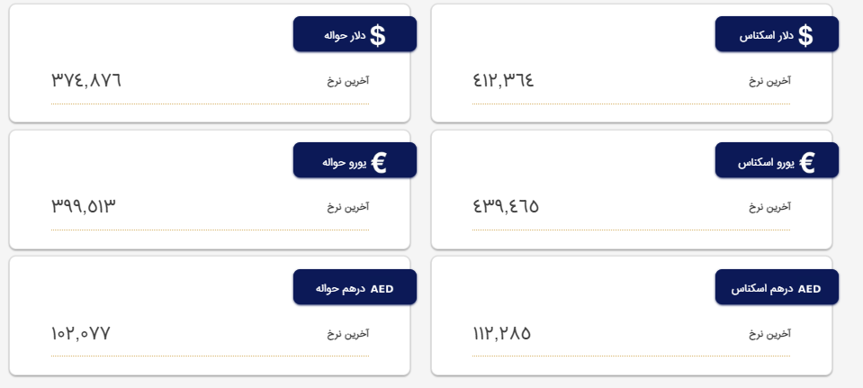 در پی کاهش نرخ ارز در بازار غیر رسمی، این مرکز نیز همین روند را طی کرد. آخرین نرخ ثبت شده برای هر دلار آمریکا به صورت اسکناس و حواله به ترتیب ۴۱ هزار و ۲۳۶ تومان و ۳۷ هزار و ۴۸۷ تومان، برای یورو نیز ۴۳ هزار و ۹۴۶ تومان به صورت اسکناس با ۳۹ هزار و ۹۵۱ تومان به صورت حواله است.