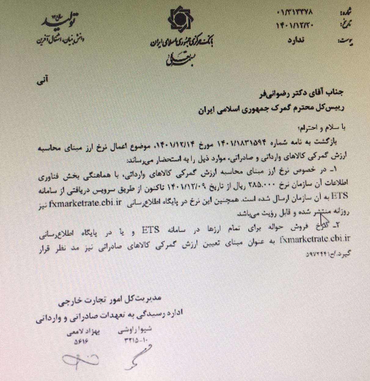 در قسمت پایانی مکاتبه مذکور آمد است، نرخ فروش حواله برای تمام ارزها در سامانه ای تی اس و یا در پایگاه اطلاع رسانی fxmarketrate.cbi.irبه عنوان مبنای تعیین ارزش گمرکی کالاهای صادراتی نیز مد نظر قرار گیرد.