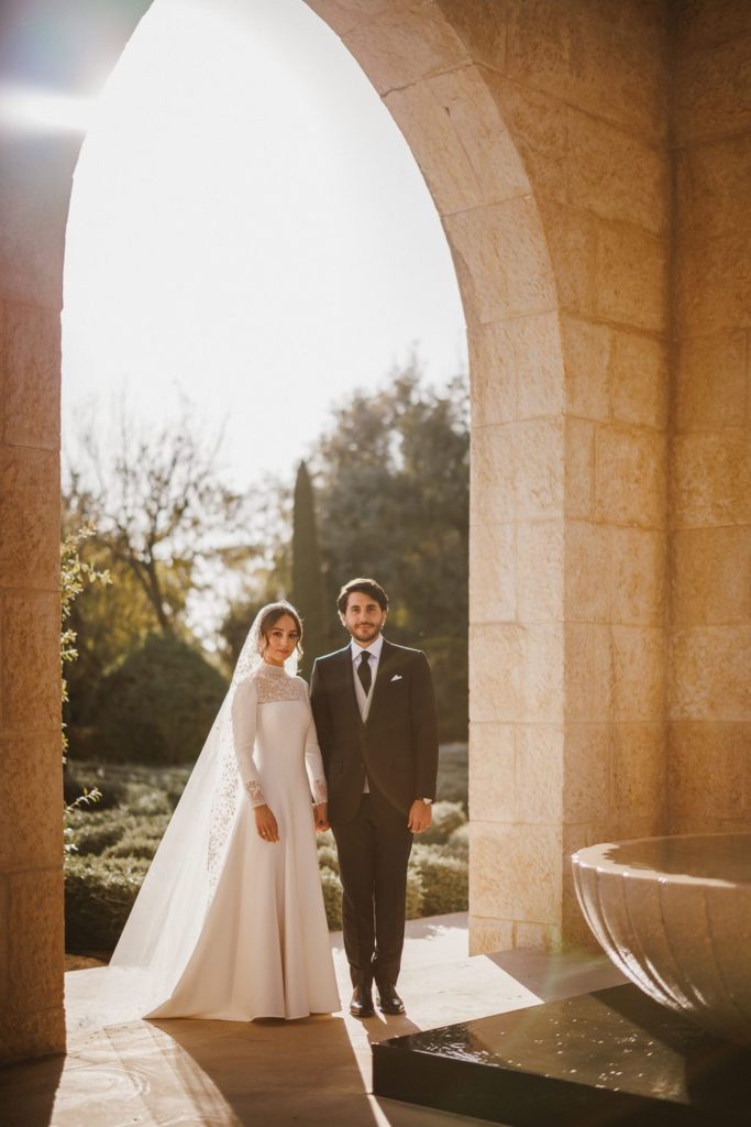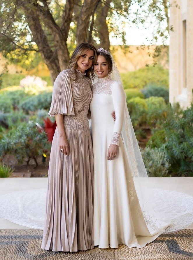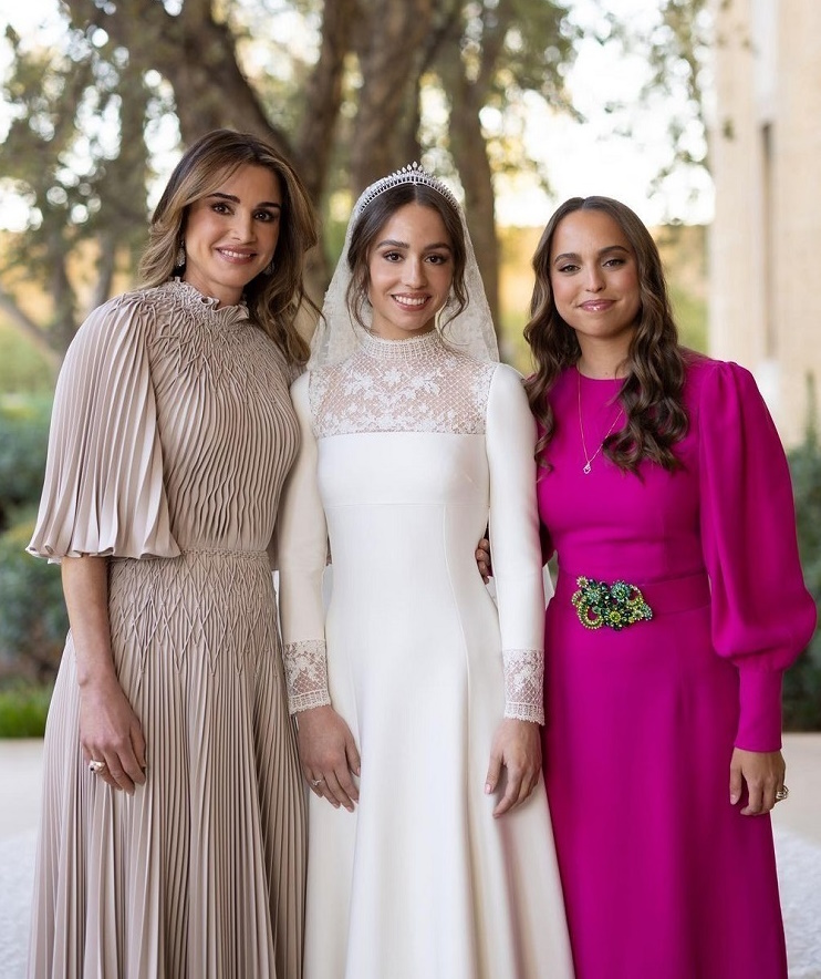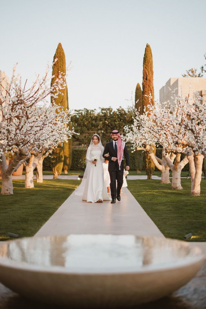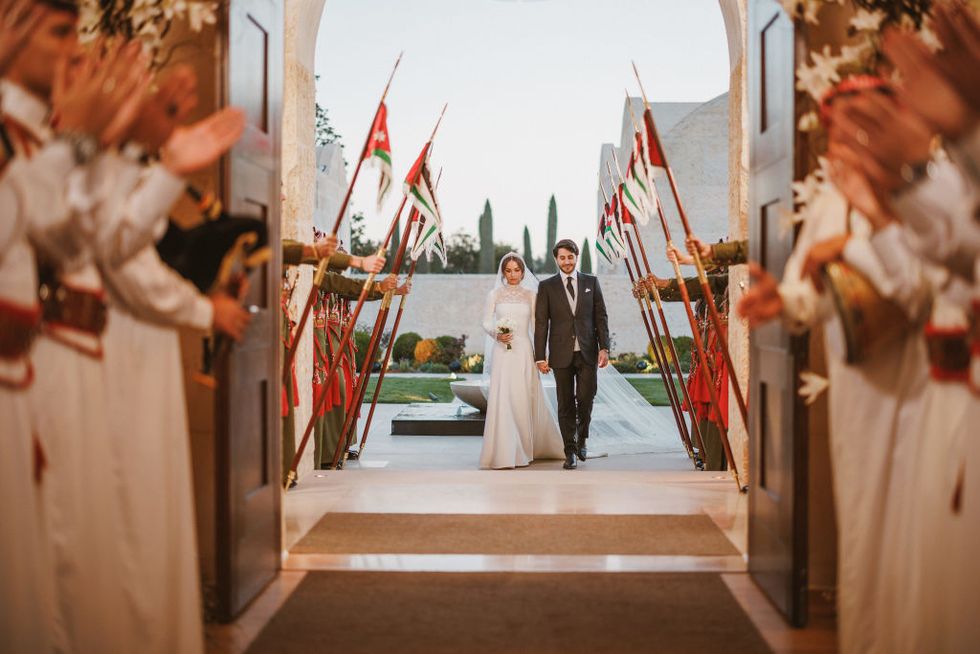 پیش از این، دختر پادشاه اردن، با لباس سفید عروس بسیار بلند و آستینهای توری با یک تاج الماس، توسط ولیعهد حسین بن عبدالله، برادر بزرگش، از باغهای کاخ اسکورت شد.