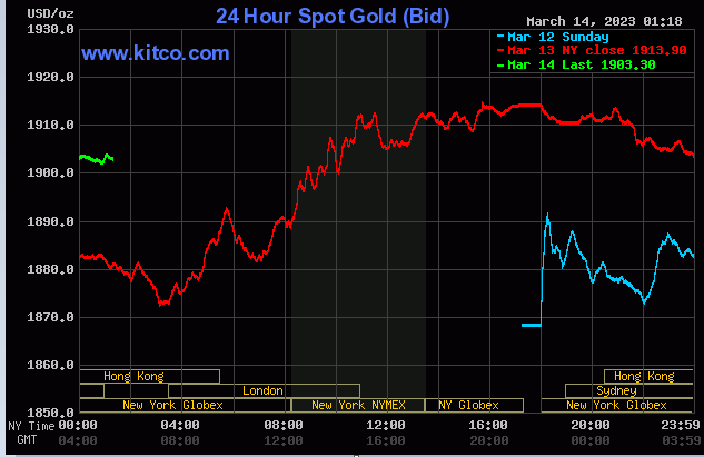 قیمت طلا روز دوشنبه با وجود تلاش مقامات ایالات‌متحده برای محدو کردن اثرات تعطیلی بانک سیلیکون ولی و بازگشت اعتماد سرمایه گذاران به سیستم بانکی این کشور بیش از دو درصد جهش کرد و به بالاترین حد خود از سوم فوریه و ۱۹۱۴ دلار و ۵۸ سنت رسید.