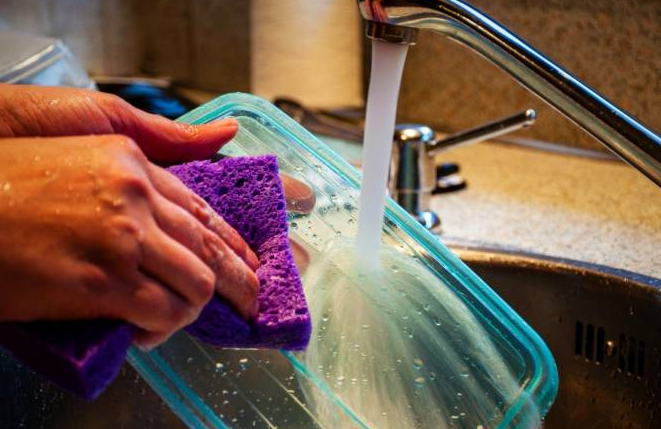 ۱- خیس کردن پلاستیک در داخل ظرف پر از آب گرم و صابون به مدت ۱۰ دقیقه