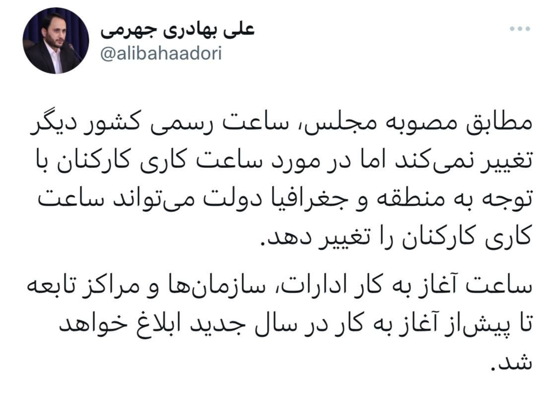 به گزارش سایت طلا،علی بهادری جهرمی سخنگوی دولت روز چهارشنبه ۲۴ اسفند در توییتر نوشت: مطابق مصوبه مجلس، ساعت رسمی کشور دیگر تغییر نمیکند اما در مورد ساعت کاری کارکنان با توجه به منطقه و جغرافیا دولت میتواند ساعت کاری کارکنان را تغییر دهد.