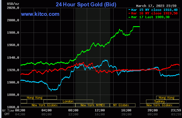 تای وونگ، تاجر مستقل فلزات مستقر در نیویورک اظهار کرد که طلا با توجه به ترس از انتشار اخبار بد بانکی بیشتر در آخر هفته افزایش یافته است و امیدوار است که فدرالرزرو افزایش نرخ بهره را در هفته آینده متوقف کند.