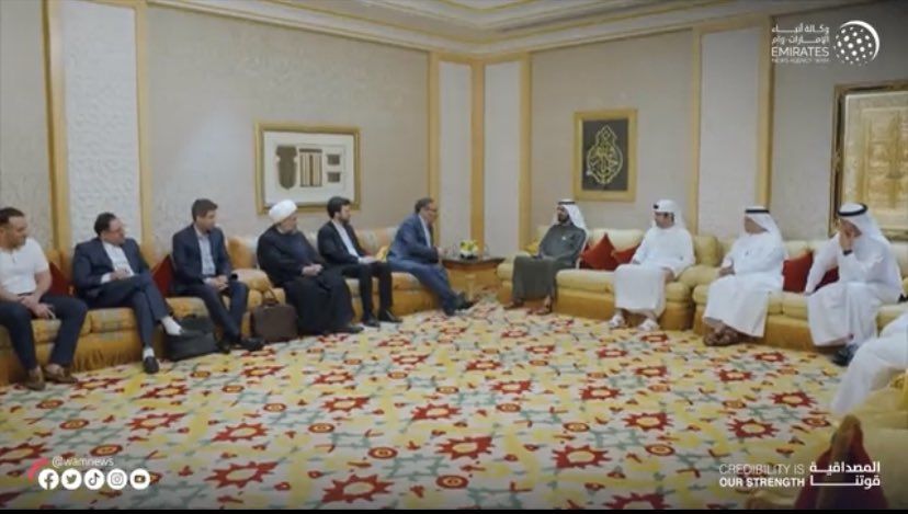 این عکس را «خبرگزاری امارات» از دیدار شمخانی و شیخ راشد نخستوزیر امارات و حاکم دوبی منتشر کرده؛ در عکس یک نفر در ردیف هیات ایرانی، با تیشرت و کفش کالج بدون جوراب نشسته!