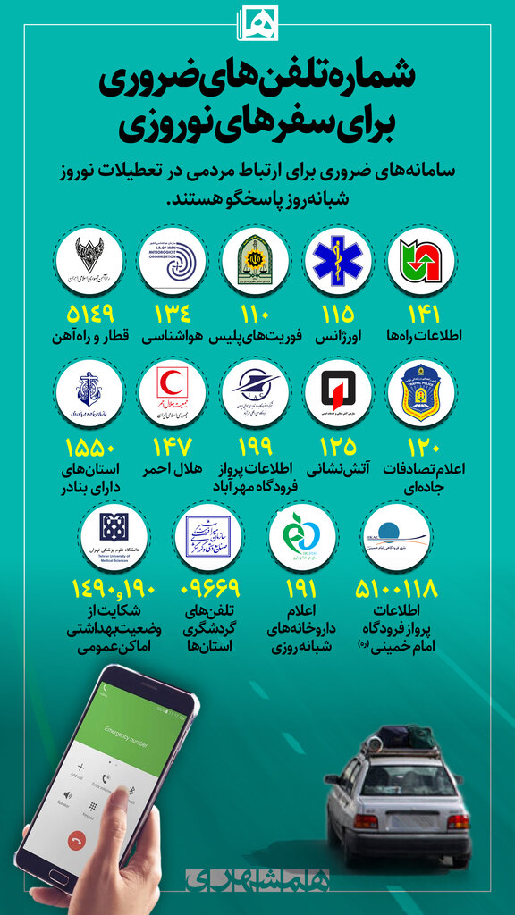 معاون وزارت راه و شهرسازی افندیزاده شماره تماسهایی را برای ارتباط مردمی در تعطیلات نوروز به این شرح اعلام کرد: اطلاعات راهها با سامانه ۱۴۱، قطار و راه آهن با سامانه ۵۱۴۹ هواشناسی ۱۳۴، اطلاعات پرواز ۱۹۹ و فرودگاه امام خمینی(ره) ۵۱۰۰۱۱۸ و استانهای دارای بنادر با ۱۵۵۰ است که شبانهروز پاسخگو هستند.