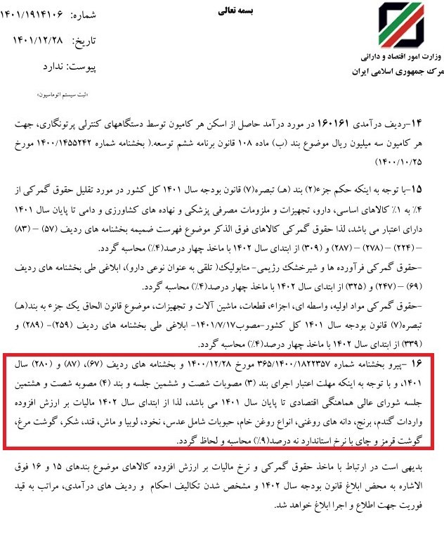 16- 9 درصد مالیات بر ارزش افزوده جهت واردات گندم ، برنج ، دانه های روغنی ، حبوبات شامل عدس ، نخود و لوبیا و ماش و قند و شکر و گوشت مرغ و گوشت قرمز و چای از ابتدای سال 1402 محاسبه خواهد شد.