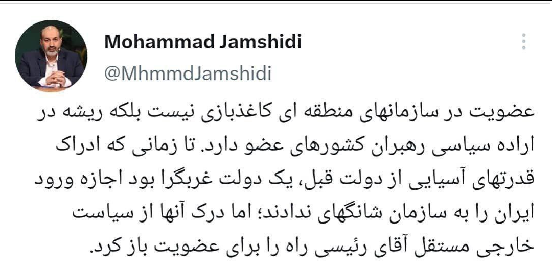 به گزارش سایت طلا ، محمد جمشیدی در توییتی نوشت: عضویت در سازمانهای منطقه ای کاغذبازی نیست بلکه ریشه در اراده سیاسی رهبران کشورهای عضو دارد. تا زمانی که ادراک قدرتهای آسیایی از دولت قبل، یک دولت غربگرا بود اجازه ورود ایران را به سازمان شانگهای ندادند؛ اما درک آنها از سیاست خارجی مستقل آقای رئیسی راه را برای عضویت باز کرد.