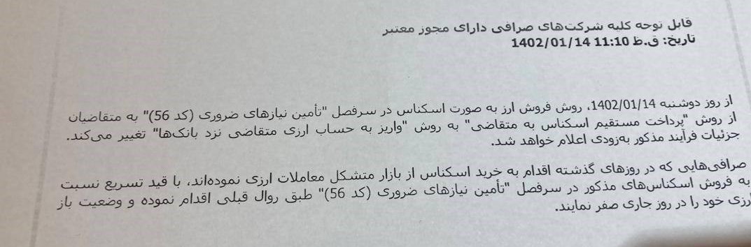 همچنین در ادامه اطلاعیه خطاب به صرافیها قید شده است: صرافیهایی که در روزهای گذشته اقدام به خرید اسکناس از بازار متشکل معاملات ارزی نمودهاند، با قید تسریع نسبت به فروش اسکناسهای مذکور در سرفصل تأمین نیازهای ضروری کد 56 طبق روال قبلی اقدام نموده و وضعیت بازارزی خود را در روز جاری صفر نمایند.