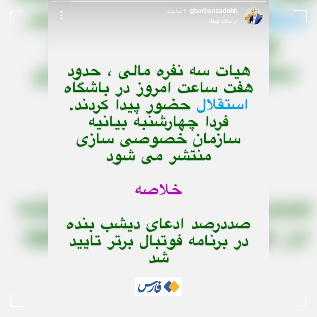قربانزاده نوشت: هیئت ۳ نفره مالی حدود ۷ ساعت در باشگاه استقلال حضور پیدا کردند. بیانیه سازمان خصوصیسازی امروز منتشر میشود. خلاصه، صددرصد ادعای من در برنامه فوتبال برتر تایید شد.