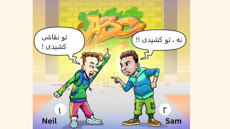 پسر شماره ۱ روی دیوار نقاشی کشیده است. اگر با دقت به تصویر نگاه کنید می بینید که او اسپری رنگ دارد و لباسش رنگی شده است.