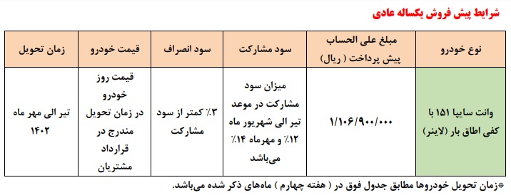 در این طرح، وانت سایپا ۱۵۱ با کفی اتاق بار (لاینر) با مبلغ علیالحساب پیش پرداخت ۱۱۰ میلیون و ۶۹۰ هزار تومان به مشتریان عرضه میشود. موعد تحویل این خودرو نیز تیر الی مهر ۱۴۰۲ خواهد بود.