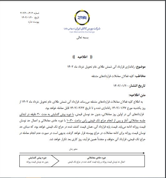 قرارداد آتی شمش طلای خام با سررسید خرداد ۱۴۰۲ از امروز، یکشنبه ۲۷ فروردین ۱۴۰۲ راه اندازی می شود.