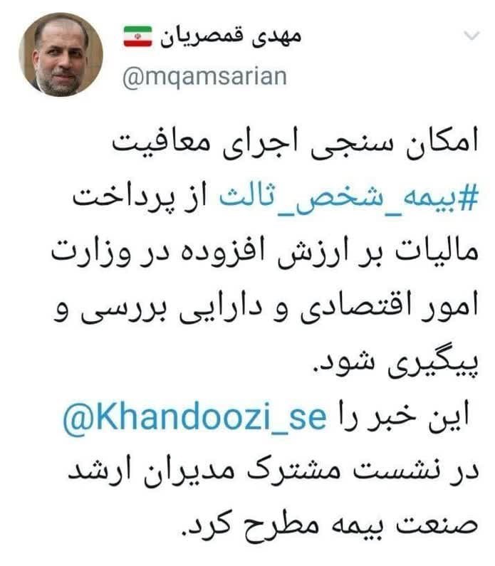 طبق اعلام وزیر اقتصاد، امکان سنجی اجرای معافیت بیمه شخص ثالث از پرداخت مالیات بر ارزش افزوده بررسی می شود.