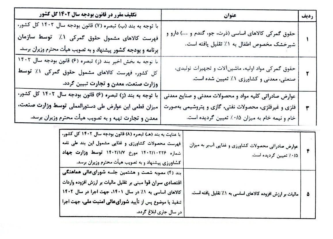 از این رو خواهشمند است به منظور تحقق شعار سال 1402 دستور فرمایید دستگاهها و وزارتخانههای مربوطه، به قید فوریت حسب تکالیف مقرر در قانون بودجه سال جاری به شرح مندرج در جدول ذیل اقدام نمایند تا روند ترخیص کالاها توسط گمرک جمهوری اسلامی ایران با شرایط پیشبینی شده در قانون موصوف میسر گردد.