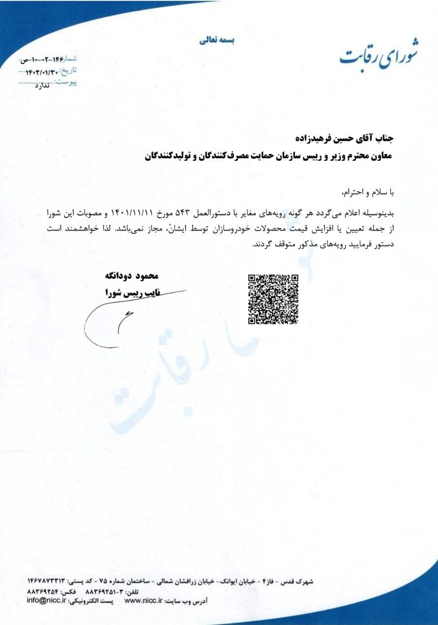 "بدین وسیله هرگونه رویههای مغایر با دستورالعمل 543 مورخ 11 بهمن 1401 و مصوبات این شورا از جمله تعیین یا افزایش قیمت محصولات خودروسازان توسط ایشان مجاز نمیباشد لذا خواهشمند است دستور فرمایید رویههای مذکور متوقف شود."