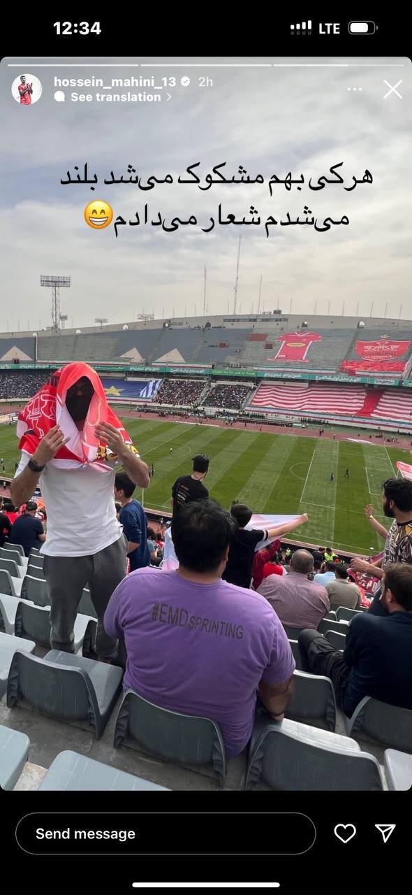 حسین ماهینی کاپیتان سابق پرسپولیس دیروز در بین تماشاگران و در طبقه دوم ورزشگاه دربی را به این شکل تماشا کرده است.