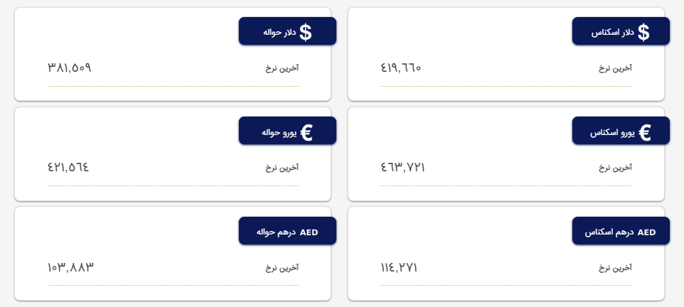 درهم امارات عربی متحده ۱۱۳ هزار و ۲۴۲ ریال خریداری و ۱۱۴ هزار و ۲۷۱ ریال فروخته شد. لیر ترکیه هم به ترتیب ۲۱ هزار و ۴۱۲ و ۲۱ هزار و ۶۰۷ ریال خرید و فروش شد.