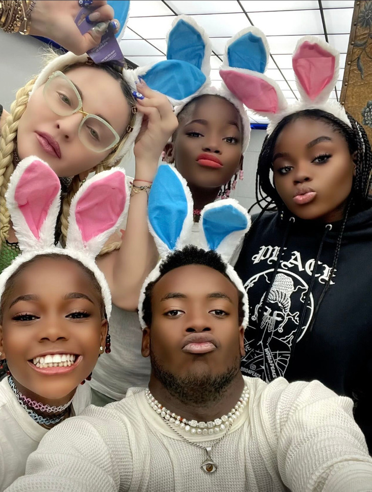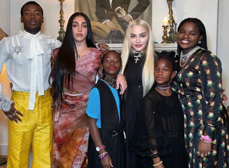 مدونای ۶۴ ساله مادر ۶ فرزند است: استری و استلا، دوقلوهای ۱۰ ساله، مرسی جیمز ۱۷ ساله، دیوید ۱۷ ساله، لوردس ۲۶ ساله و روکوی ۲۲ ساله.