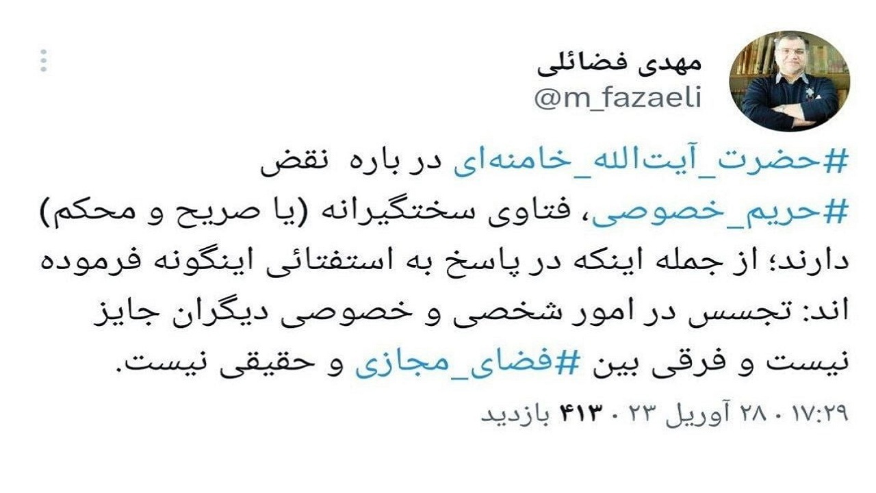 مهدی فضائلی عضو دفتر حفظ و نشر آثار رهبر انقلاب با انتشار مطلبی در حساب کاربری خود در فضای مجازی نوشت: حضرت آیتالله خامنهای در باره نقض حریم خصوصی، فتاوی سختگیرانه (یا صریح و محکم) دارند؛ از جمله اینکه در پاسخ به استفتائی اینگونه فرمودهاند: تجسس در امور شخصی و خصوصی دیگران جایز نیست و فرقی بین فضای مجازی و حقیقی نیست.