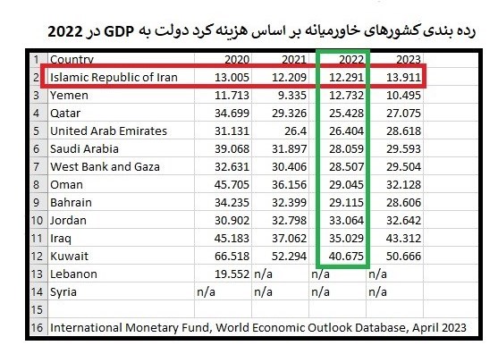 صندوق بینالمللی پول دولت ایران را به عنوان کمخرجترین دولت خاورمیانه از نظر نسبت هزینه کرد به تولید ناخالص داخلی در سال ۲۰۲۲ معرفی کرد.
