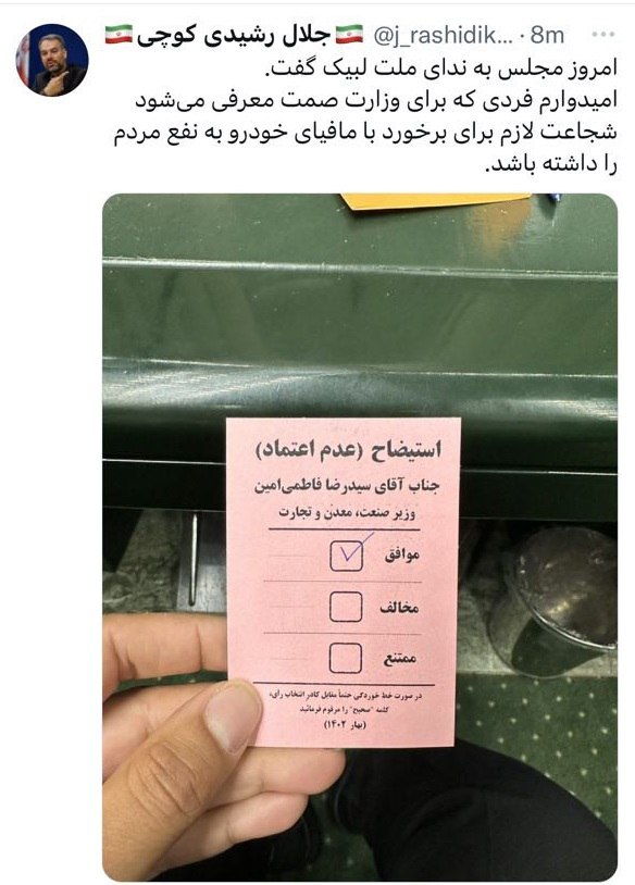 رشیدی گوچی نماینده مجلس در خصوص برکناری فاطمی امین از وزارت صمت پیام توییتری منتشر کرد.