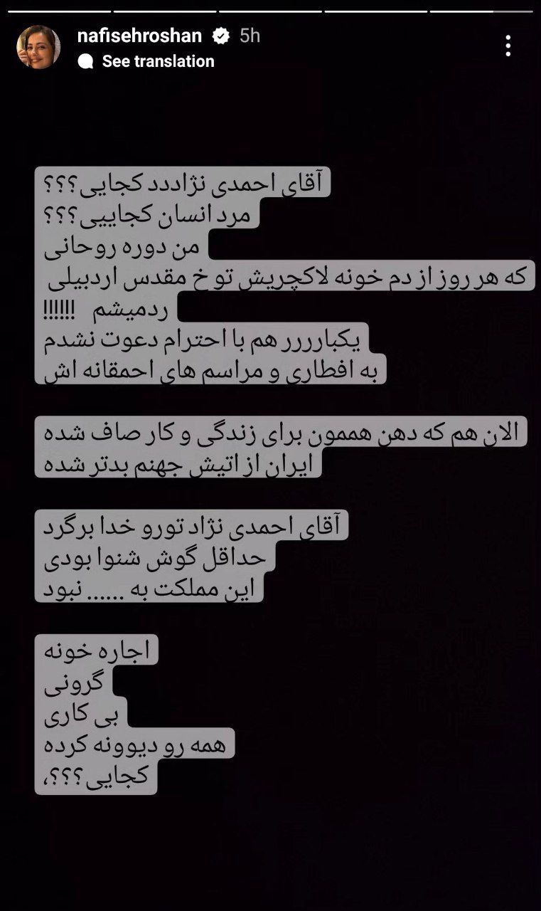 نفسیه روشن، بازیگر زن سینما و تلویزیون در دو استوری خطاب به احمدینژاد نوشت: آقای احمدی نژاد کاش هنوز بودین... داشتیم زندگی می کردیم امثال من بعد از شما، در دوره روحانی خان و بعدش روزی هزار بار برای زندگی سالم کردن مردیم و خاک شدیم یکی مثل من دیگه نمی کشه... آقای احمدی نژاد هنر دوست کجایی؟