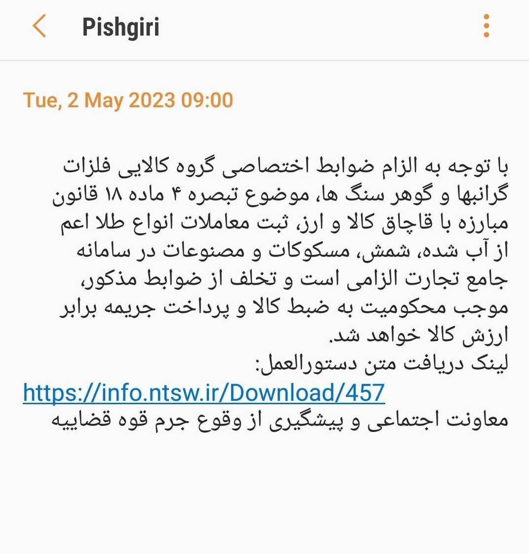 بر اساس متن این پیامک، تخلف از ضوابط اختصاصی گروه کالایی فلزات گرانبها و گوهرسنگها، موجب محکومیت فرد خاطی به ضبط کالا و پرداخت جریمه برابر ارزش کالا خواهد شد.