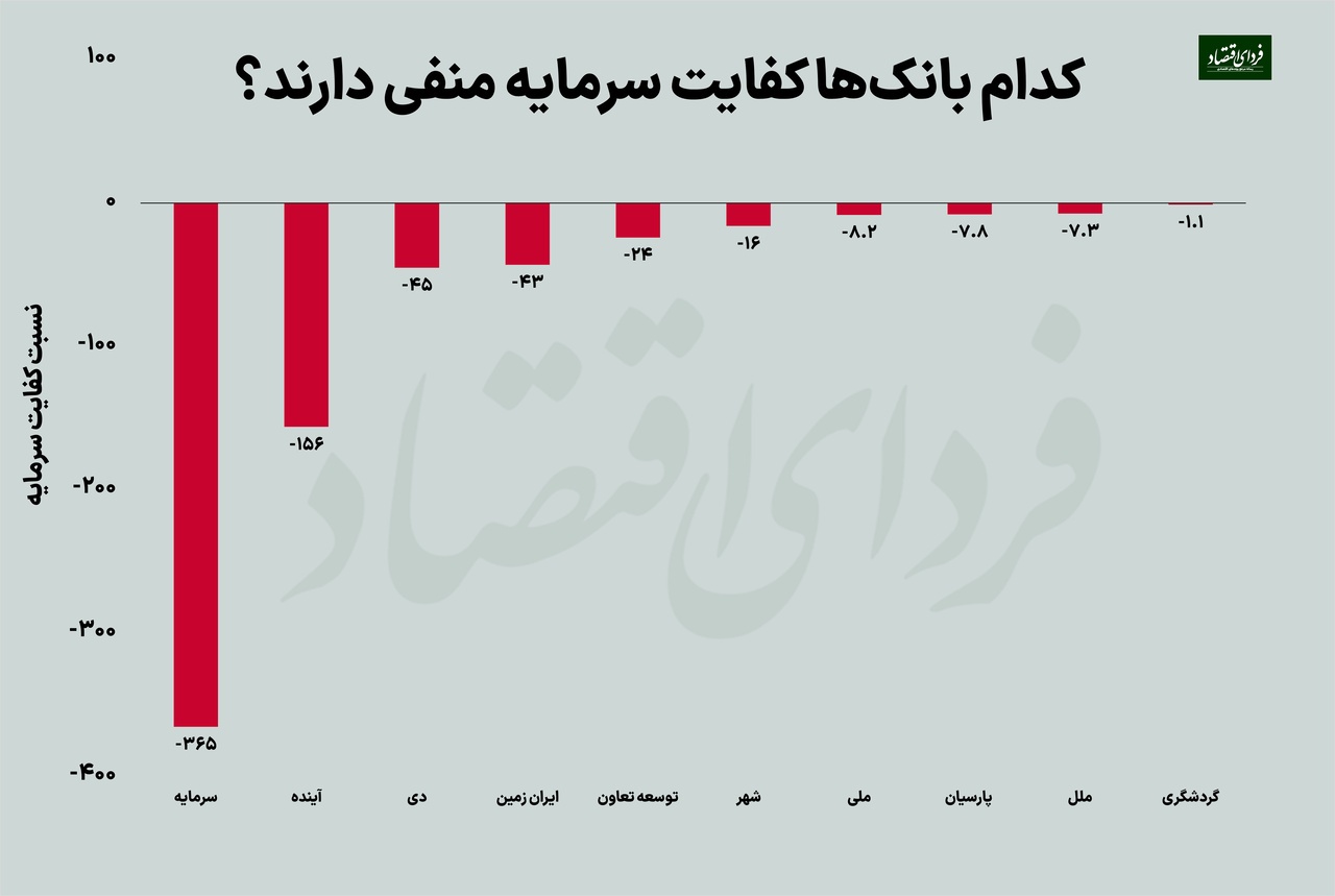 همانطور که در نمودار بالا مشاهده می‌شود، بر اساس اطلاعات موجود در مورد بانک‌های کشور، ۱۰ بانک دارای نسبت کفایت سرمایه منفی هستند که در این بین، بانک‌های سرمایه و آینده، با اختلاف بالایی از بقیه وضعیت بدتری دارند و پس از آن‌ها بانک‌های دی و ایران‌‎زمین در رتبه‌های سوم و چهارم از این منظر قرار دارند.
