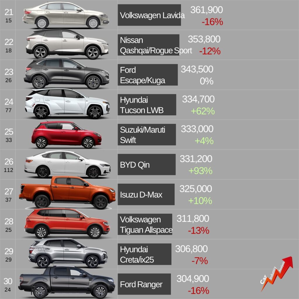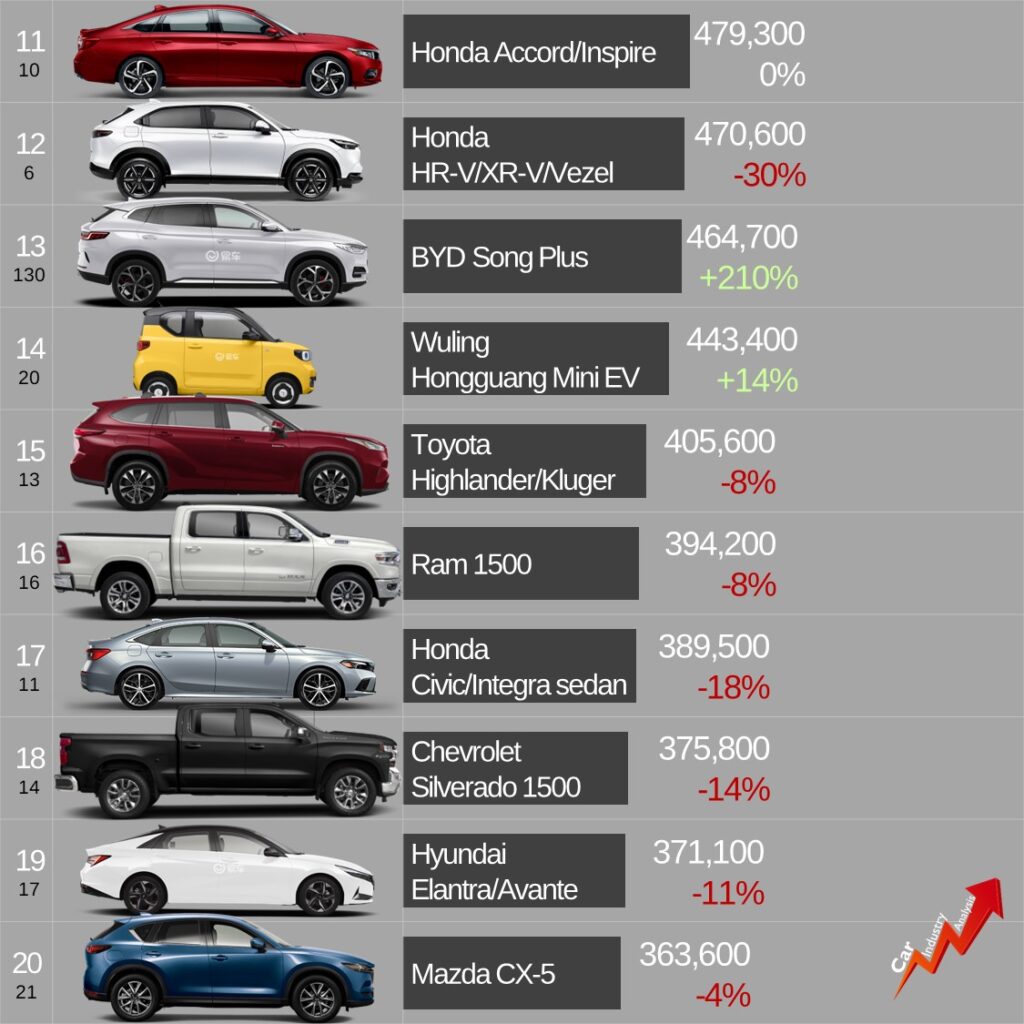 علاوه بر این، BYD با سانگ پلاس در جایگاه سیزدهم درخشید. این مدل بالاتر از وولینگ هونگ گوانگ مینی، به محبوبترین خودروی چینی سال ۲۰۲۲ تبدیل شد. اکثر مدلهای BYD رشد خوبی از خود نشان دادند.