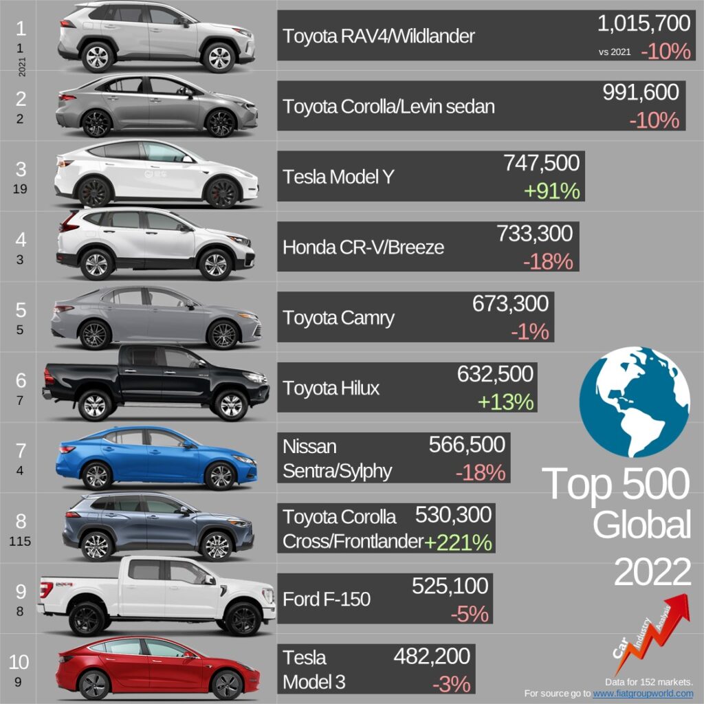 رده بندی ۱۰ خودرو پرفروش جهان در سال ۲۰۲۲
