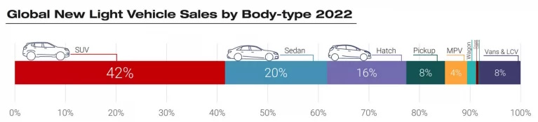 سهم شاسیبلندها از کل فروش خودرو در سراسر جهان از ۳۹.۷ درصد در سال ۲۰۲۱ به ۴۱.۳ درصد در سال ۲۰۲۲ رسیده است. با این افزایش، مجموع فروش شاسیبلندها به ۳۲.۸ میلیون دستگاه رسیده است. سهم سدانها، هاچبکها و پیکاپها نیز به ترتیب ۲۰ درصد، ۱۶ درصد و ۸ درصد بوده است.