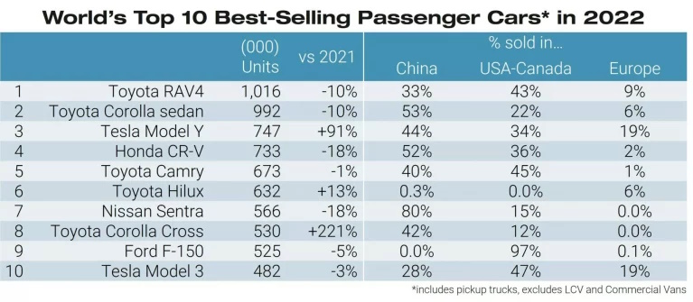 ۵ محصول تویوتا یعنی راو ۴ (اول)، کرولا (دوم)، کمری (پنجم)، هایلوکس (ششم) و کرولا کراس (هشتم) در بین ۱۰ خودروی پرفروش سال حضور داشتند. سایر رتبهها در اختیار دو مدل تسلای ذکرشده، هوندا CR-V (چهارم)، نیسان سنترا (هفتم) و فورد F-150 (نهم) قرار داشت.