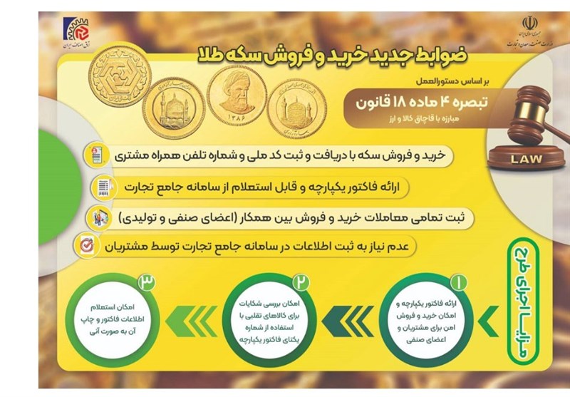 به موجب ابلاغ ضوابط اختصاصی گروه فلزات گرانبها و گوهرسنگ ها و الزام ثبت معاملات توسط اعضای صنفی مرتبط و اطلاع رسانی در این زمینه، معاونت صنایع عمومی دفتر صنایع خلاق و ورزشی وزارت صمت پوستر یکپارچه ضوابط جدید خرید و فروش سکه طلا را طراحی کرده است.
