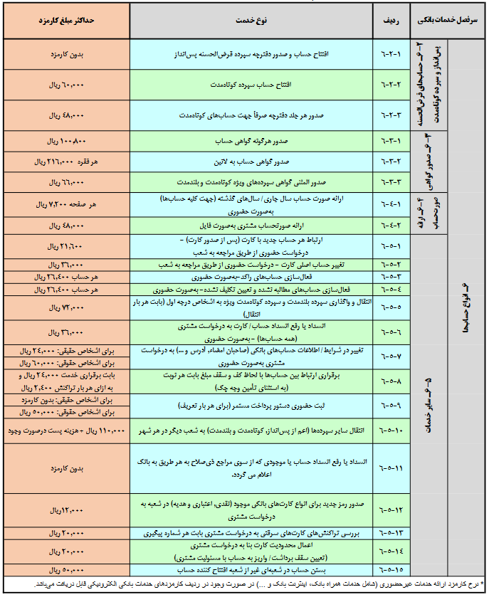 کارمزد حسابهای قرضالحسنه، پسانداز و سپرده کوتاه مدت، صدور گواهی، ارائه صورتحساب و سایر خدمات حساب بانکی در جدول زیر قابل مشاهده است.