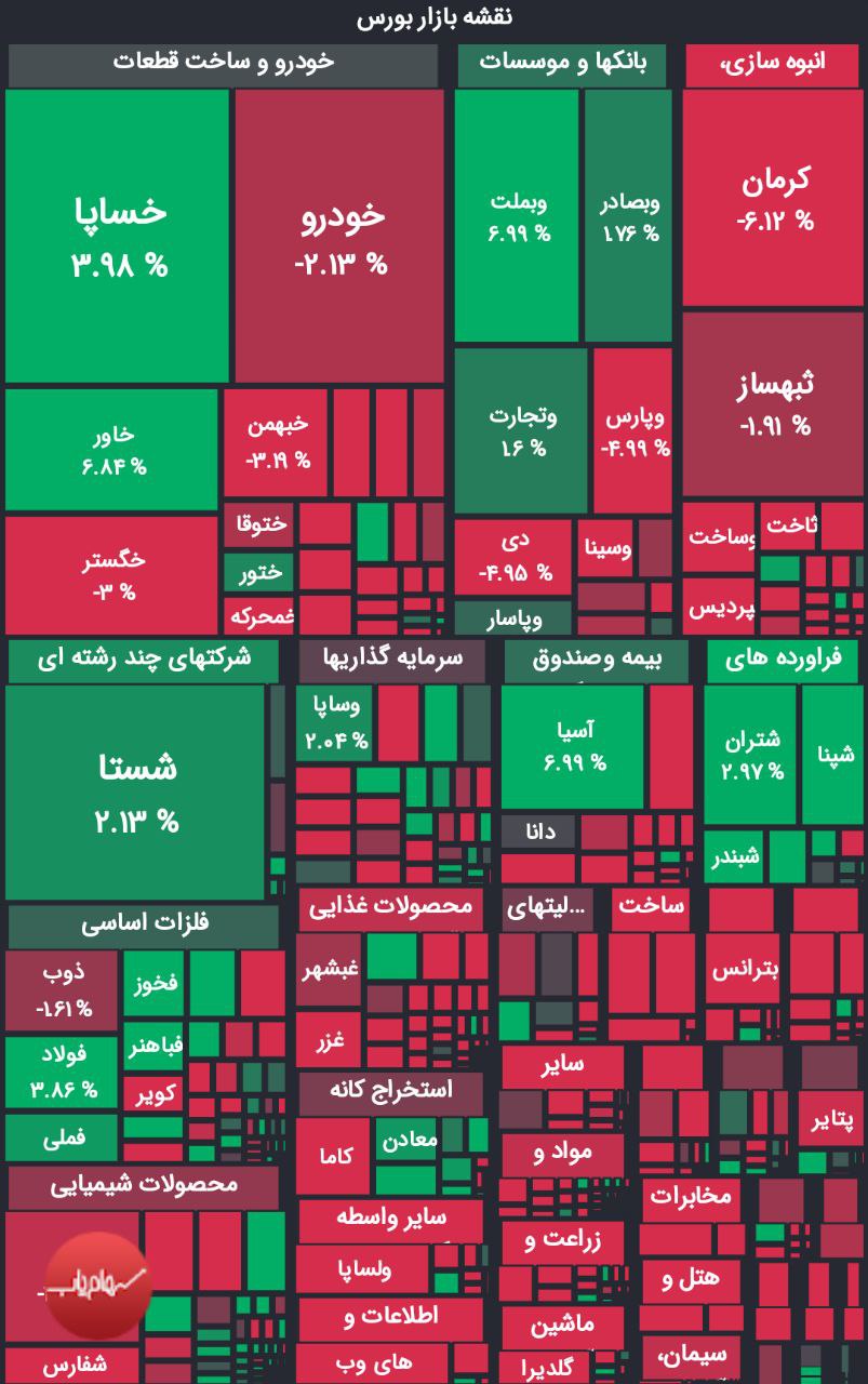 ۱۱۵ نماد بورسی مثبت و ۲۲۸ نماد منفی بودند که از میان آنها فولاد مبارکه اصفهان و بانک ملت نسبت به سایر نمادها بیشترین تاثیر مثبت و توسعه معادن و صنایع معدنی خاورمیانه نسبت به سایر نمادها بیشترین تاثیر منفی را روی بورس گذاشتند.
