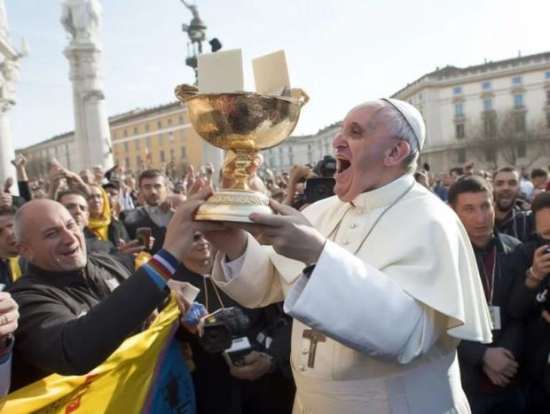 به‌هرحال در این مسابقه خوردن مصالح ساختمانی، برنده کسی نبود جز پاپ فرانسیس و می‌بینید که جام قهرمانی را هم بالای سر برده است.