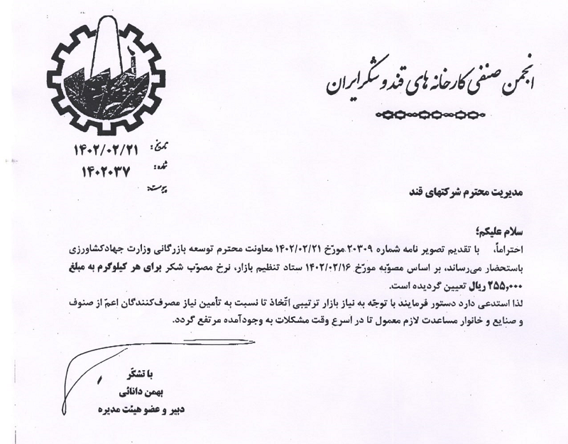 در نامه دبیر و عضو هیئت مدیره ا انجمن صنفی کارخانه های قند و شکر ایران، به مدیریت شرکت های قند اعلام شده است که بر اساس مصوبه 16 اردیبهشت ستاد تنظیم بازار نرخ مصوب شکر برای هر کیلوگرم به مبلغ 25هزار و 500 تومان تعیین شده است.