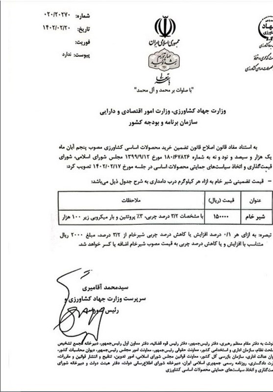 سرپرست وزارت جهاد کشاورزی جزئیات مصوبه افزایش قیمت شیرخام را به وزارت اقتصاد و سازمان برنامه و بودجه اعلام کرد.