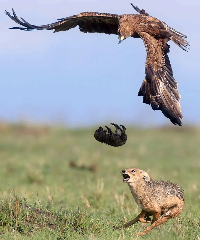 پس از چند تلاش ناموفق، عقاب بالأخره موفق شد طعمه خود را به چنگ بیاورد، اما این پیروزی فقط چند ثانیه طول کشید. عقاب توله را گرفت، شغال به دنبالش پرید و توله در اواسط پرواز از چنگال عقاب رها شد.