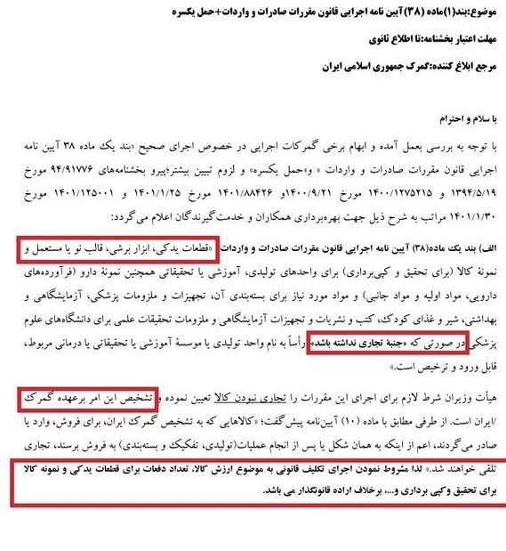 با توجه به نکات مطرح شده، اخیرا در بخشنامهای که سوی مدیر کل دفتر واردات گمرک ایران ارائه شده است، دستورالعمل تکمیلی و تبیینی در خصوص بند 1 ماده 38 آیین نامه اجرایی قانون مقررات صادرات و واردات به گمرکات اجرایی ابلاغ شد. در بخش اول این ابلاغیه آمده: شروط بند یک ماده 38 قانون امور گمرکی عبارت است از نداشتن جنبه تجاری و و ورود توسط واحدهای تولیدی دارای پروانه بهرهبرداری. همچنین بر این اساس بند 1ماده 38 قانون مذکور، سقف ارزشی لحاظ نشده است.
