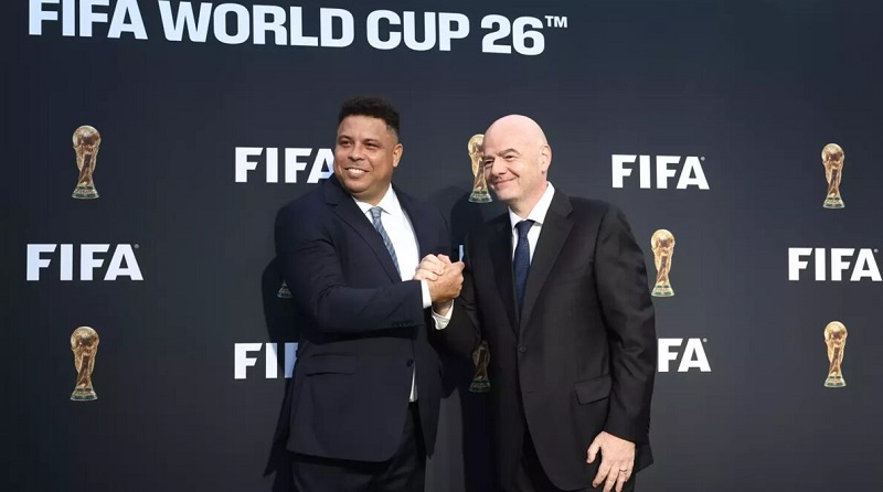 مراسم رونمایی از لوگوی جام جهانی ۲۰۲۶ با حضور رونالدو نازاریو اسطوره برزیلی دنیای فوتبال در کنار جانی اینفانتینو رئیس فیفا برگزار شد.