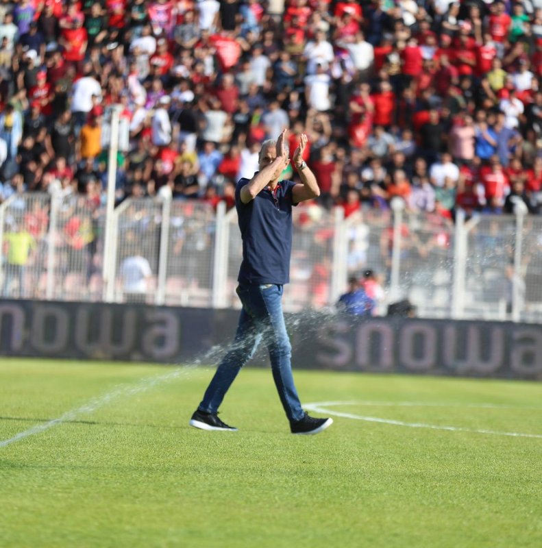 لحظاتی پیش سرمربی تیم پرسپولیس در حالی که مسئولان ورزشگاه مشغول آبپاشی چمن بودند، وارد زمین شد تا کیفیت زمین چمن را مورد ارزیابی قرار دهد.